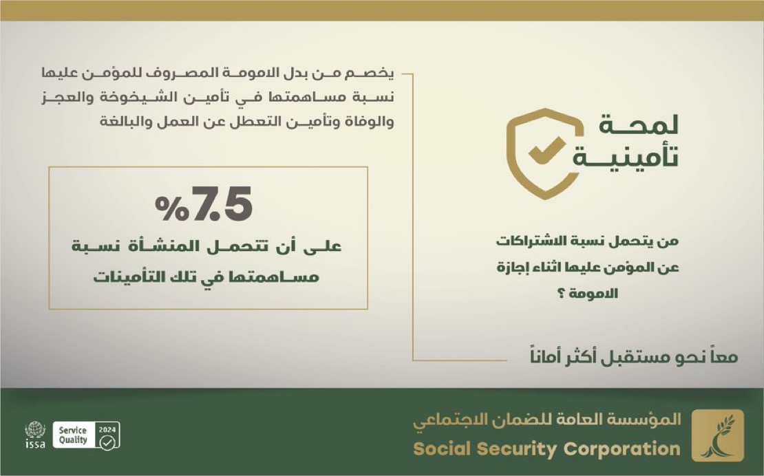 ويأتي هذا التوضيح في إطار تعزيز الوعي التأميني وضمان حماية حقوق المرأة العاملة، بما ينسجم مع أهداف المؤسسة في دعم الاستقرار الوظيفي والعدالة الاجتماعية.