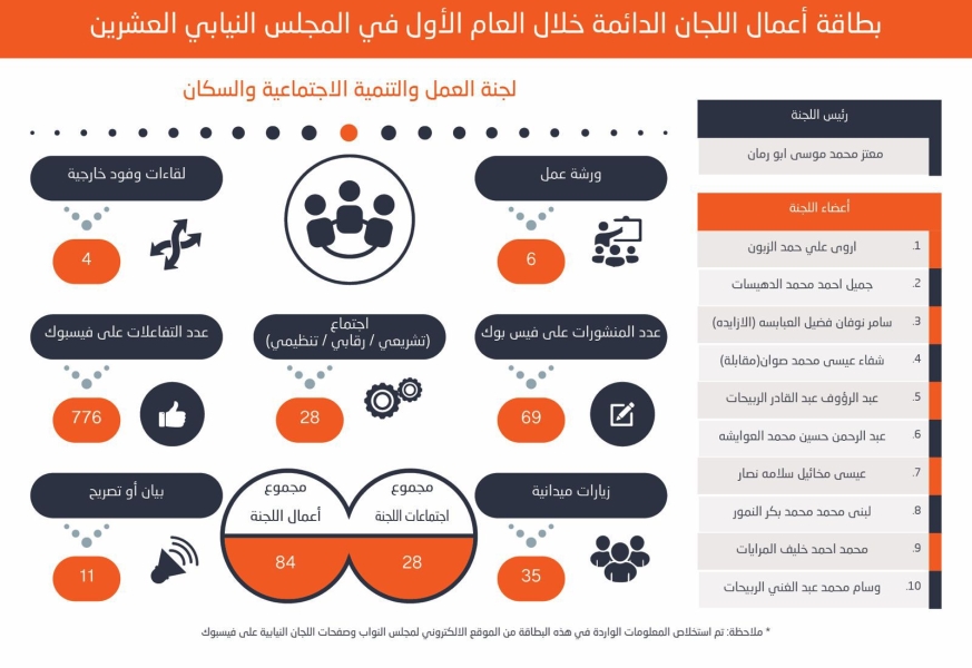 وفي ذات السياق أظهرت نتائج المتابعة الرقمية لحسابات اللجان النيابية على منصة فيسبوك أن مجموع المنشورات الصادرة عن جميع اللجان خلال العام الأول بلغ 667 منشورًا، فيما وصل مجموع التفاعلات (إعجابات، تعليقات، ومشاركات) إلى 27,935 تفاعلًا، ما يعكس حضورًا رقميًا متباينًا بين اللجان من حيث النشاط والتفاعل مع الجمهور.