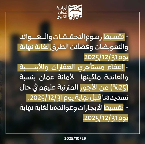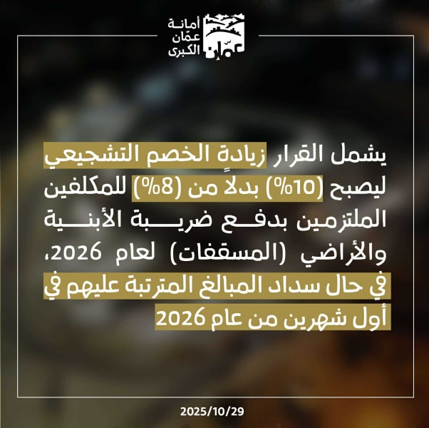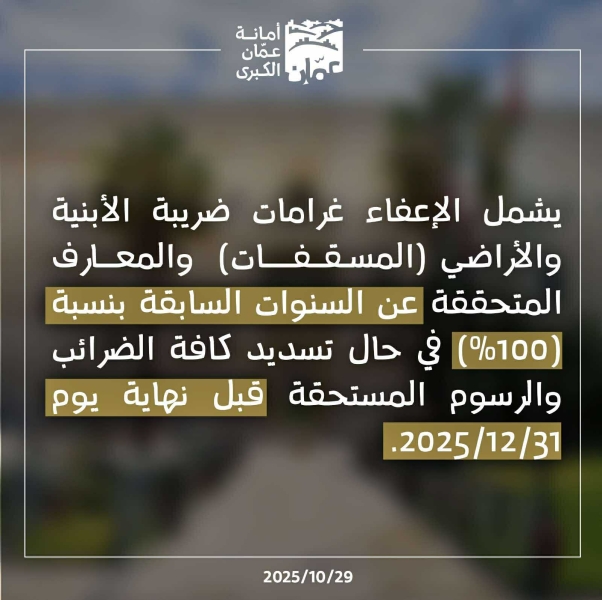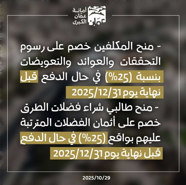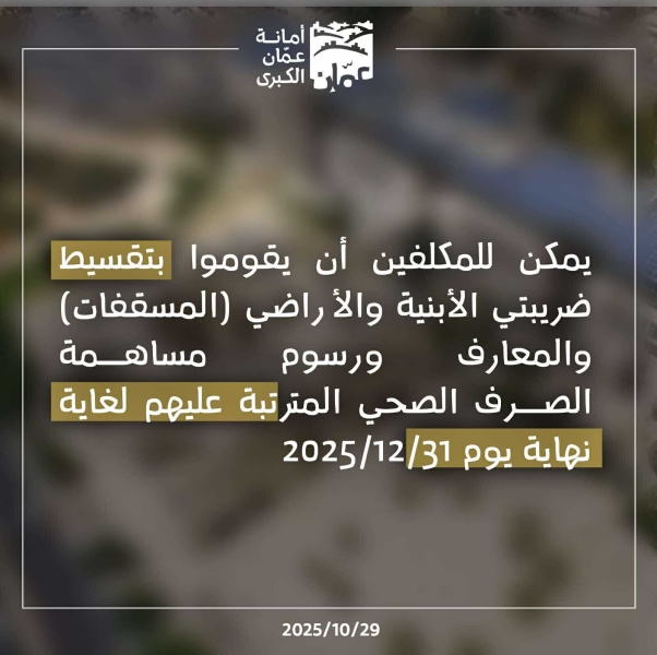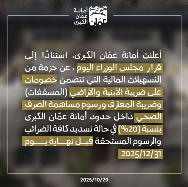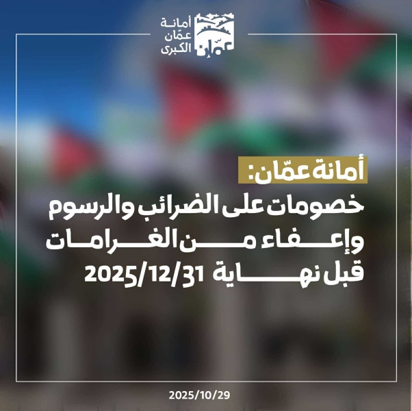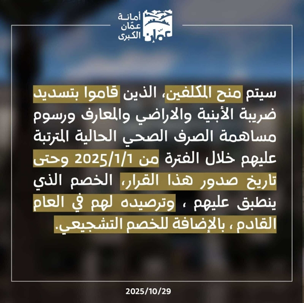 ويشمل القرار منح خصم على ضريبة الأبنية والأراضي وضريبة المعارف ورسوم مساهمة الصرف الصحي للسنة الحالية والسنوات السابقة المفروضة على الأراضي والعقارات داخل حدود أمانة عمان.