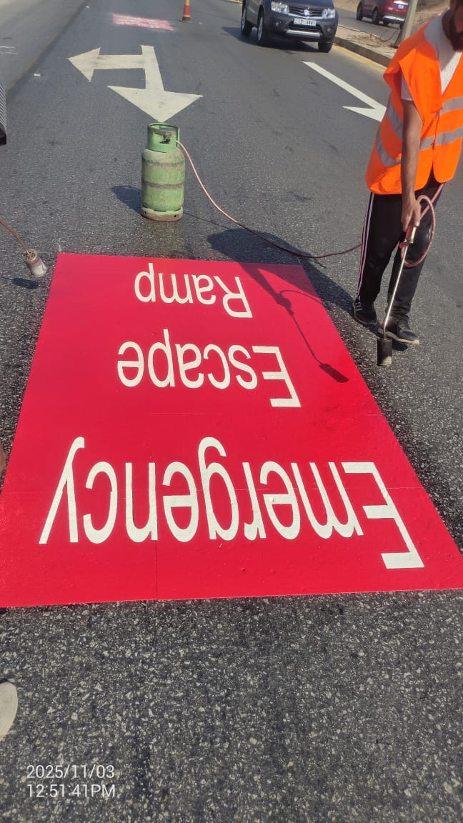 كما تم تركيب الحواجز الواقية والعواكس الضوئية لعزل المهارب عن الطريق الرئيسي، وتنفيذ إجراءات السلامة المرورية لضمان الاستخدام الآمن لها في الحالات الطارئة.