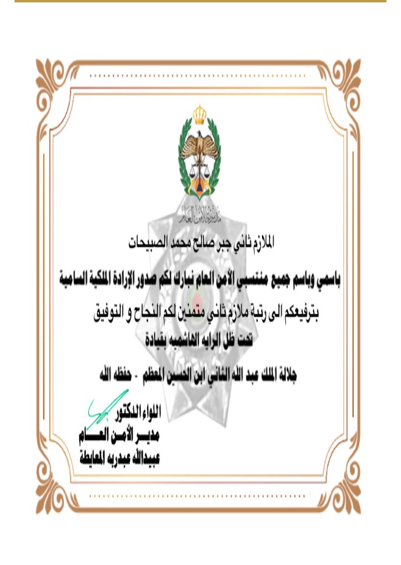 بمناسبة صدور الإرادة الملكية السامية بترفيعه إلى رتبة (ملازم ثاني )، مباركًا هذا الإنجاز الذي يعكس مسيرة من العطاء والانضباط، ويليق برجال الوطن الأوفياء.