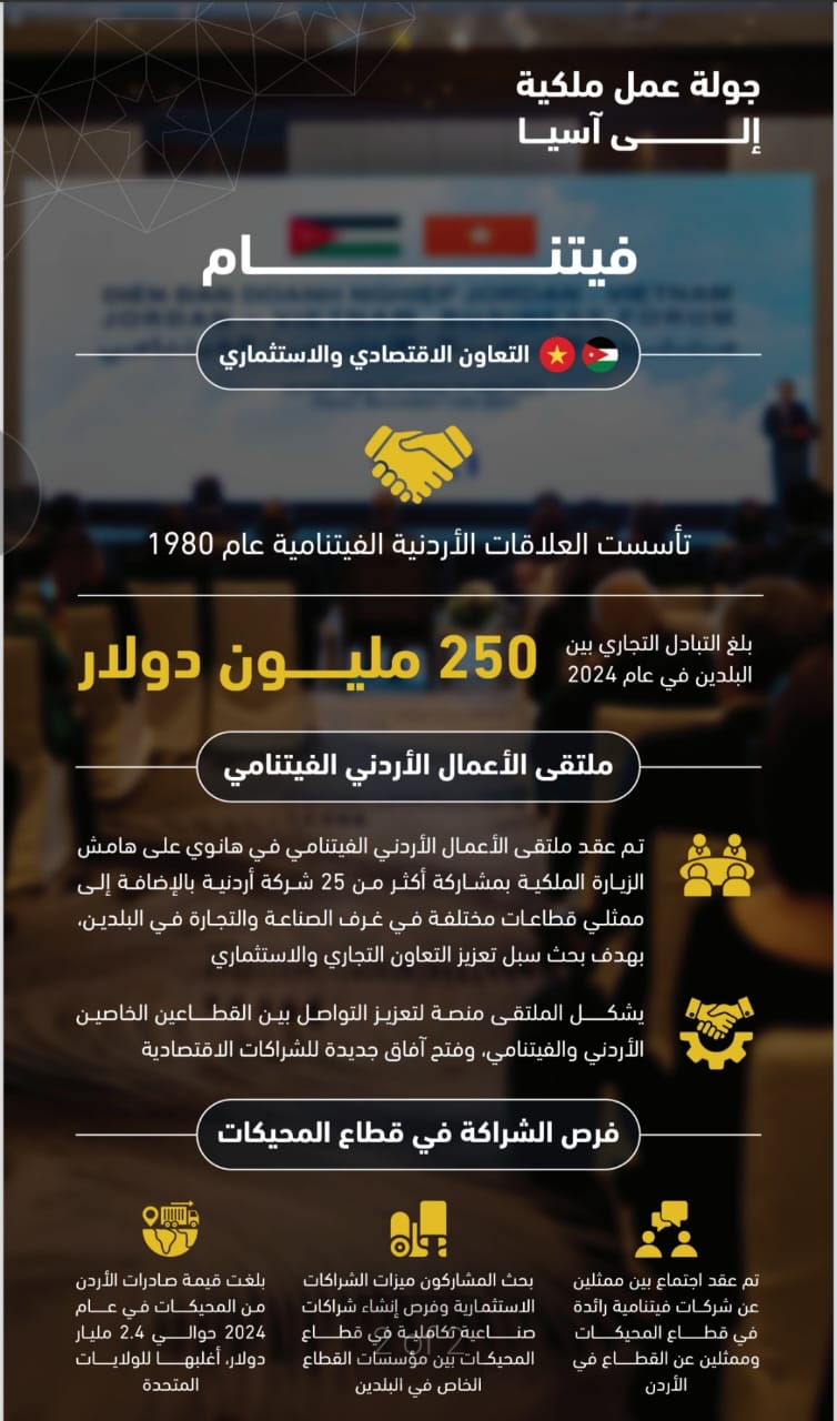 وتأتي الزيارة الملكية في سياق العلاقات الدبلوماسية والاقتصادية المتينة التي تجمع الأردن بفيتنام منذ تأسيسها عام 1980، والتي شهدت تطورًا ملحوظًا في مجالات التعاون الثنائي، إذ بلغ حجم التبادل التجاري بين البلدين نحو 250 مليون دولار عام 2024، ما يعكس تنامي الشراكة الاقتصادية بين الجانبين.