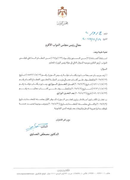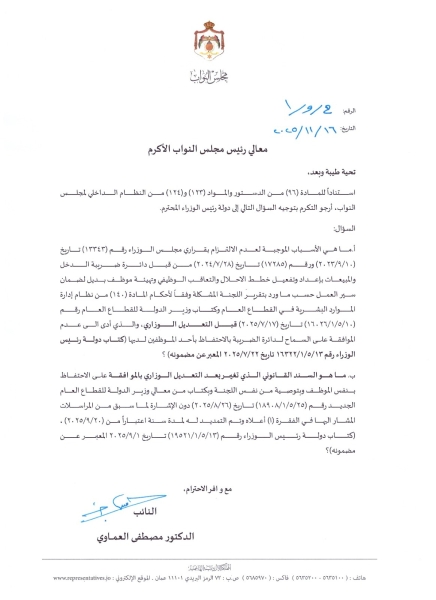 القبة نيوز ـ وجه النائب الدكتور مصطفى العماوي استفسارين إلى دولة رئيس الوزراء، يتعلقان بتمديد خدمة موظف في دائرة ضريبة الدخل والمبيعات بعد بلوغه السن القانونية، وذلك استناداً إلى نصوص الدستور والنظام الداخلي لمجلس النواب.