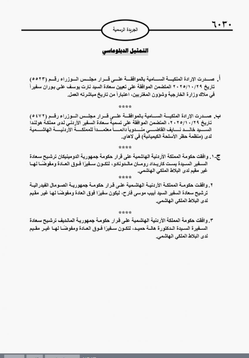 كما صدرت الإرادة الملكية السامية بالموافقة على قرار مجلس الوزراء رقم (٥٤٧٢) تاریخ ۲۰۲۵/۱۰/۲۹ ، المتضمن الموافقة على تسمية سعادة السفير الأردني لدى مملكة هولندا السيد خالد نايف القاضي مندوباً دائماً معتمداً للمملكة الأردنية الهاشمية لدى منظمة حظر الأسلحة الكيميائية في لاهاي.