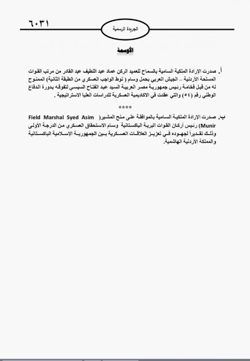 وكما صدرت الإرادة الملكية السامية بالموافقة على منح المشير ) Field Marshal Syed Asim Munir) رئيس أركان القوات البرية الباكستانية وسام الاستحقاق العسكري من الدرجة الأولى وذلك تقديراً لجهوده في تعزيز العلاقات العسكرية بين الجمهورية الإسلامية الباكستانية والمملكة الأردنية الهاشمية.