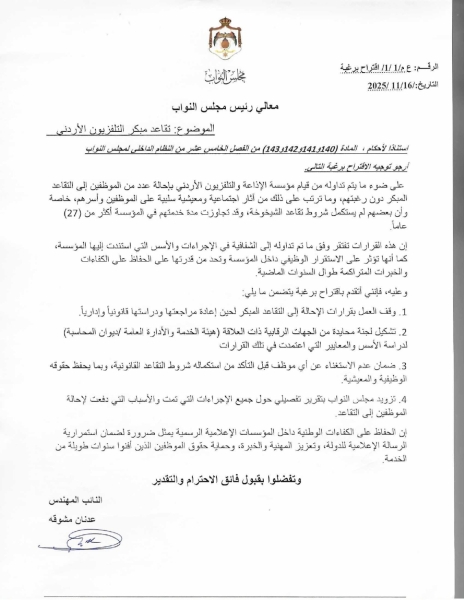 القبة نيوز ـ على ضوء ما يتم تداوله من قيام مؤسسة الإذاعة والتلفزيون الأردني بإحالة عدد من الموظفين إلى التقاعد المبكر دون رغبتهم، وما ترتب على ذلك من آثار اجتماعية ومعيشية سلبية على الموظفين وأسرهم، خاصة وأن بعضهم لم يستكمل شروط تقاعد الشيخوخة، وقد تجاوزت مدة خدمتهم في المؤسسة أكثر من (27) عاماً.