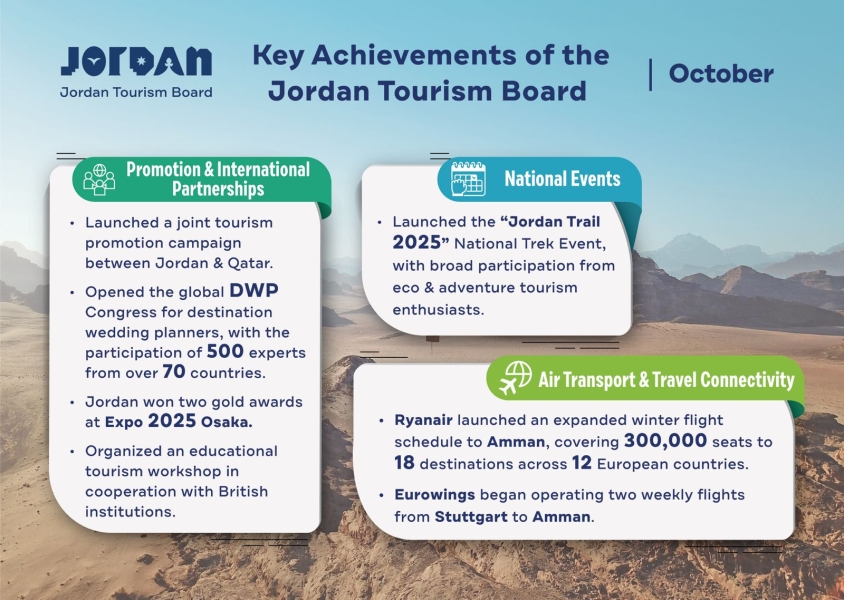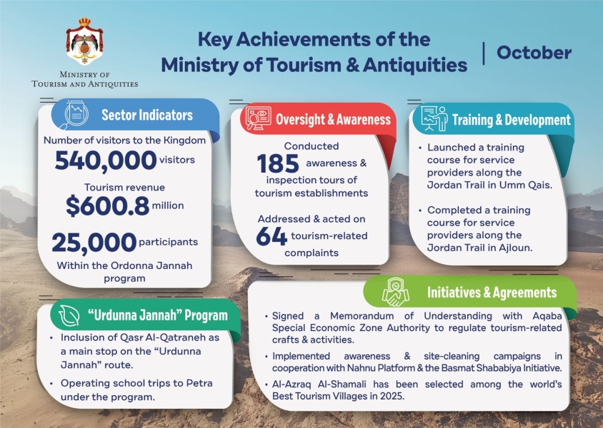 القبة نيوز- شهد القطاع السياحي في الأردن خلال شهر تشرين الأول سلسلة من الإنجازات والبرامج التطويرية التي تنسجم مع مستهدفات رؤية التحديث الاقتصادي الهادفة إلى تعزيز تنافسية المملكة، وتنويع المنتج السياحي، وتمكين المجتمعات المحلية، ودعم مسارات النمو المستدام.