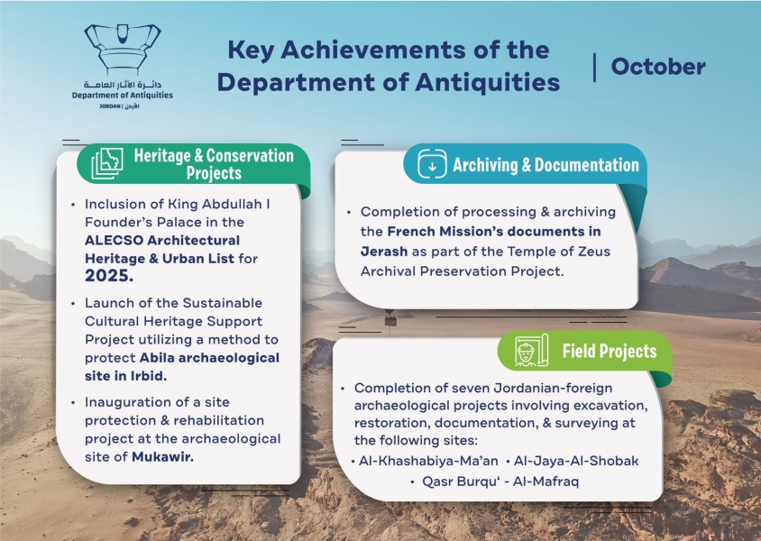 وفي إطار حماية الإرث الوطني وضمن مبادرة حماية المواقع الاثرية والتراثية والسياحية وتطويرها في رؤية التحديث الاقتصادي وهو أحد روافد النمو في السياحة الثقافية، أعلنت دائرة الآثار العامة إدراج قصر الملك المؤسس عبد الله الأول على سجل الألكسو للتراث المعماري لعام 2025، وأطلقت مشاريع لحماية وتأهيل مواقع أثرية في أبيلا ومكاور وجرش، إضافة إلى استكمال سبعة مشاريع أثرية ميدانية مع بعثات دولية.