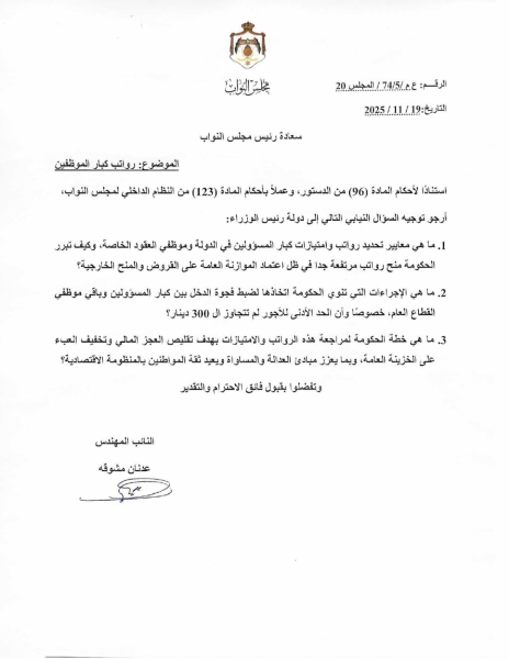 القبة نيوز ـ قدّم النائب المهندس عدنان مشوقة سؤالاً نيابياً إلى رئيس الوزراء، طالب فيه بالحصول على توضيحات مفصّلة حول رواتب كبار المسؤولين وامتيازاتهم، في ظل ما تشهده الموازنة العامة من اعتماد متزايد على القروض والمنح الخارجية.