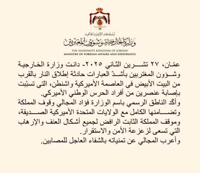 الخارجية الأردنية تدين حادثة إطلاق النار قرب البيت الأبيض