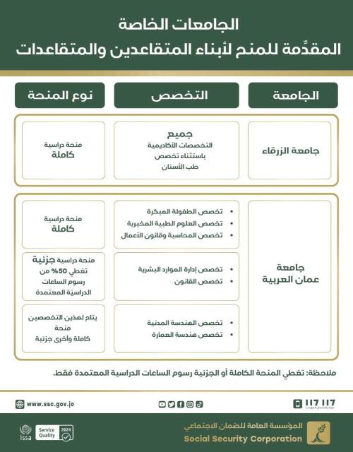 القبة نيوز -أعلنت المؤسسة العامة للضمان الاجتماعي عن فتح باب التقديم للحصول على منح دراسية جامعية لأبناء المتقاعدين الأردنيين للعام الدراسي 2025/2026، بالتعاون مع جامعتي الزرقاء وعمّان العربية.