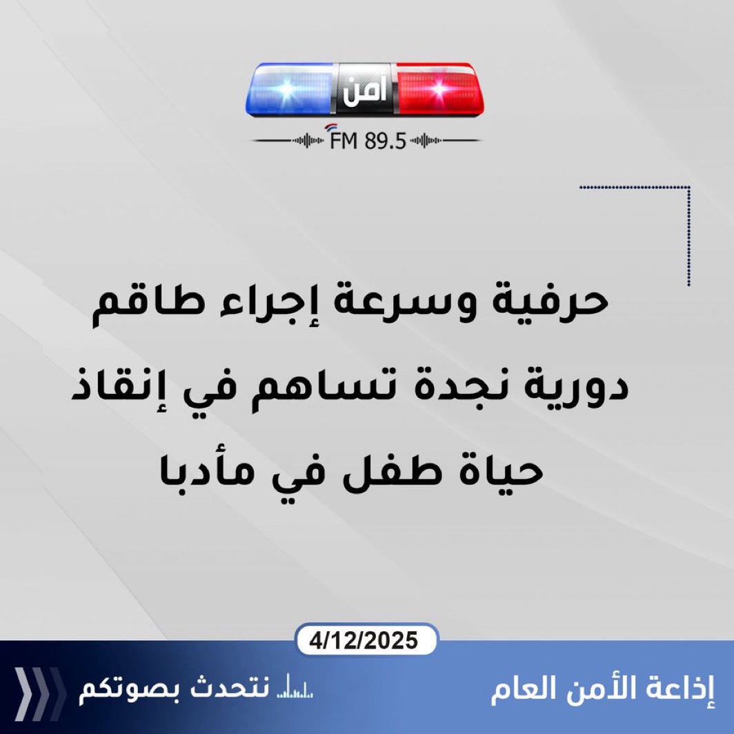 • أفراد الدورية تعاملوا مع الحالة بسرعة، وقدموا الإسعافات الأولية المخصصة للأطفال دون سن الخامسة، ما ساهم في استقرار وضع الطفل قبل نقله إلى المستشفى.
