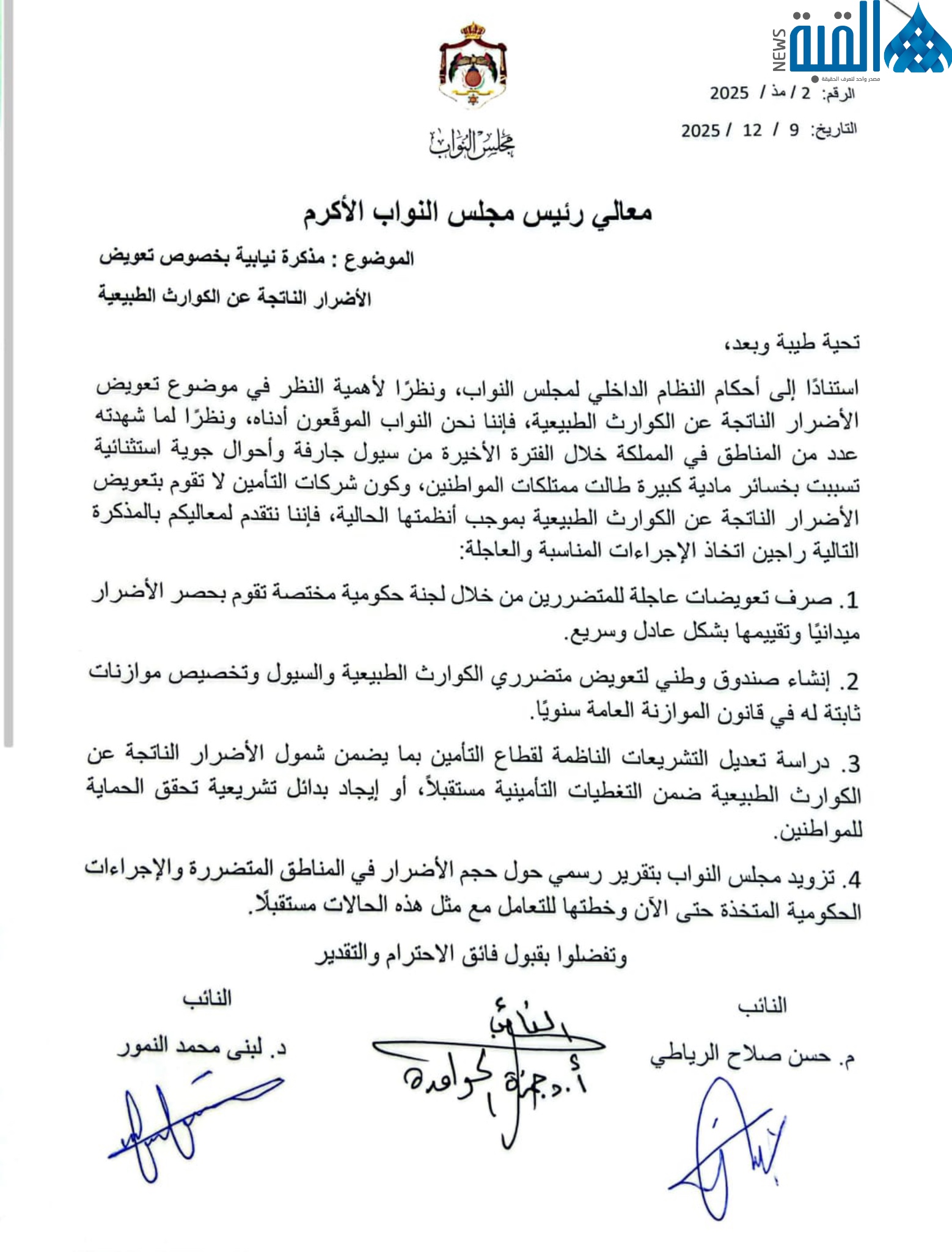 قدّم النائبان حسن صلاح الرياطي ولبنى محمد النمور مذكرة إلى رئيس مجلس النواب، طالبا فيها الحكومة باتخاذ إجراءات عاجلة لتعويض المواطنين المتضررين من الكوارث الطبيعية التي ضربت عدة مناطق في المملكة مؤخرًا، وتسببت بخسائر مادية جسيمة نتيجة السيول والأحوال الجوية الاستثنائية.