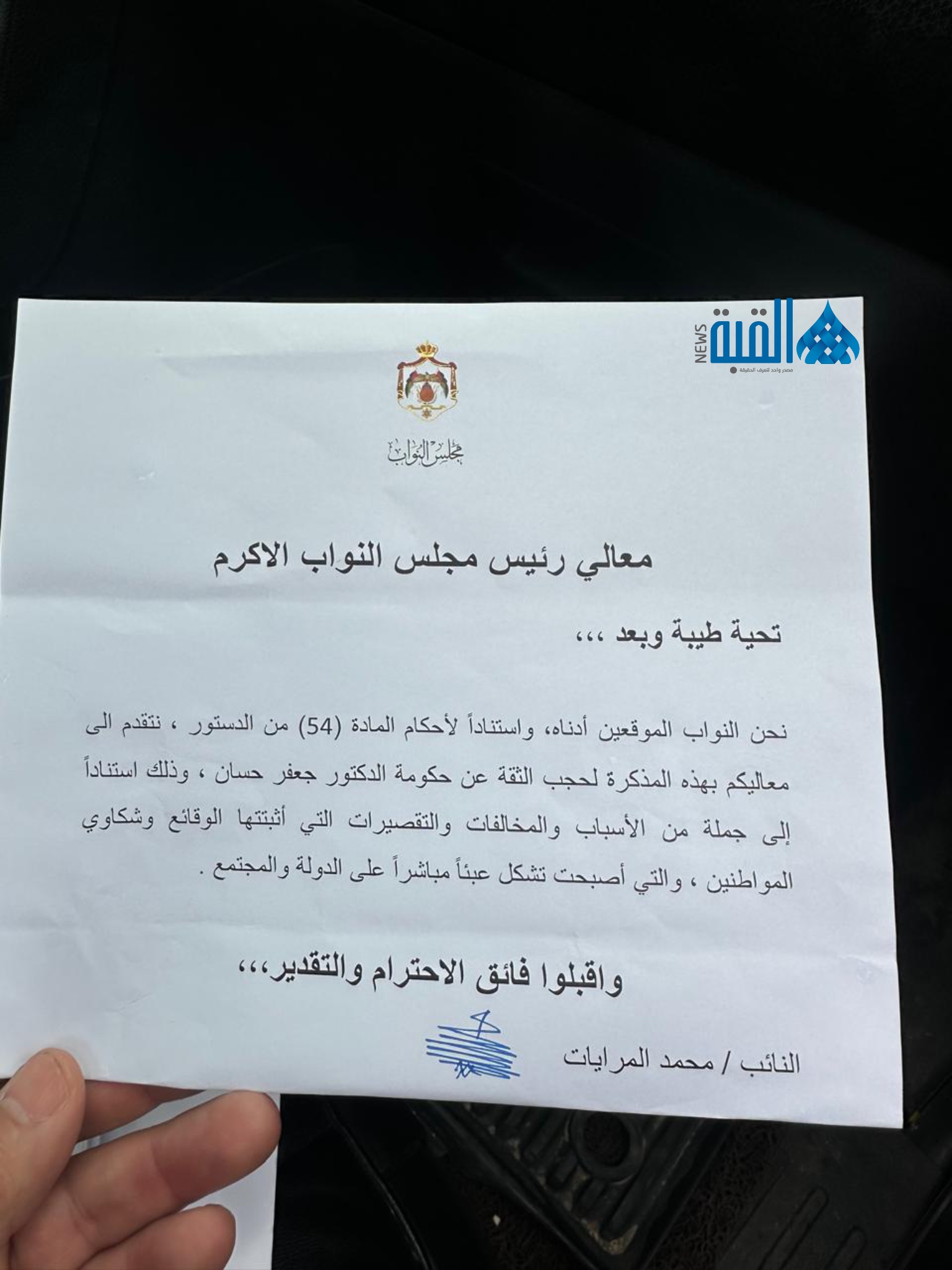 في تطور برلماني لافت، تبنّى النائب محمد المرايات مذكرة نيابية تطالب بحجب الثقة عن الحكومة، في خطوة فاجأت أوساط المجلس وأربكت المشهد السياسي، بعد أن أعلن عدد من النواب دعمهم للمذكرة منذ اللحظات الأولى لطرحها.