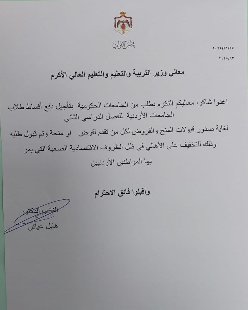 وأوضح عياش في كتابه أن هذا الطلب يأتي في إطار التخفيف عن كاهل الأسر الأردنية، في ظل الظروف الاقتصادية الصعبة التي يمر بها المواطنون، وبما يسهم في ضمان استمرارية الطلبة في تعليمهم الجامعي دون أعباء مالية إضافية.
