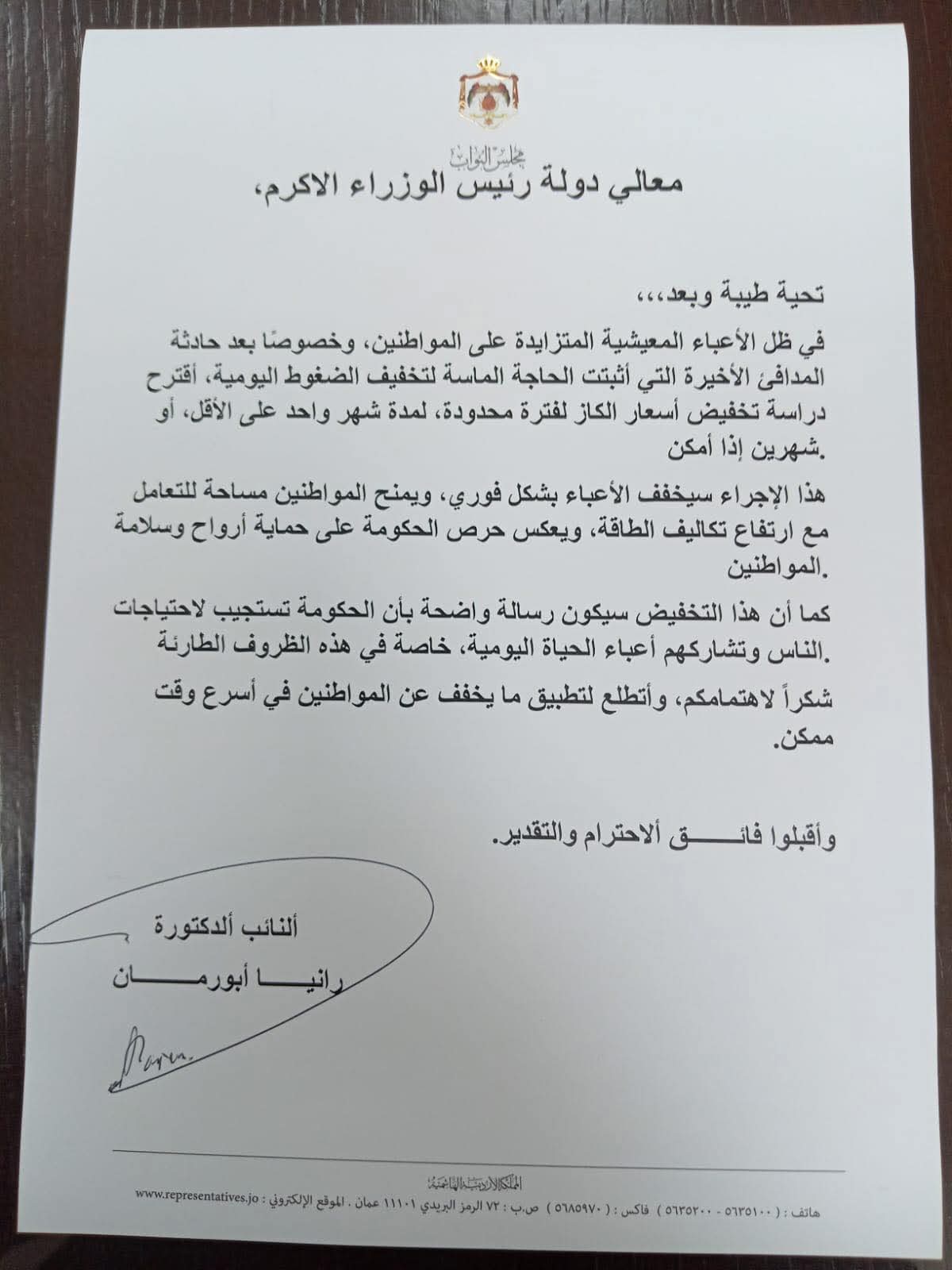 وختمت أبو رمان كتابها بالتأكيد على أهمية الإسراع في اتخاذ إجراءات عملية من شأنها التخفيف عن المواطنين في أسرع وقت ممكن.