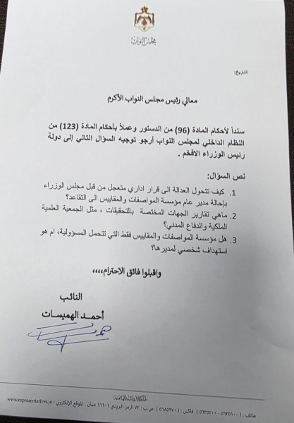 القبة نيوز ـ وجّه النائب أحمد الهميسات سؤالاً نيابياً إلى دولة رئيس الوزراء، استناداً لأحكام المادتين (96) من الدستور و(123) من النظام الداخلي لمجلس النواب، تساءل فيه عن الأسس القانونية والإدارية لإحالة مدير عام مؤسسة المواصفات والمقاييس إلى التقاعد بقرار إداري متعجّل من مجلس الوزراء.