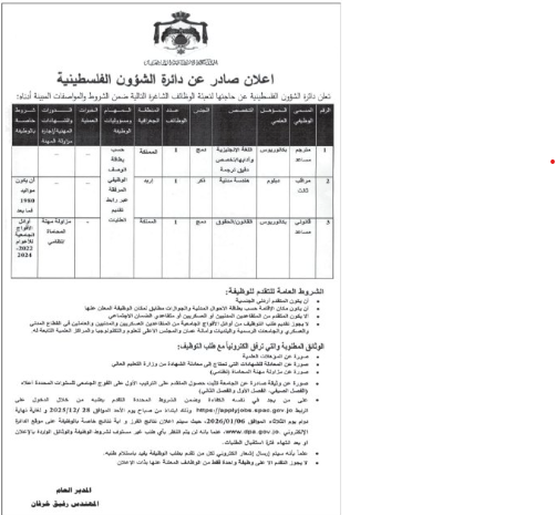 القبة نيوز - أعلنت دائرة الشؤون الفلسطينية اليوم عن حاجتها لتعبئة عدد من الشواغر الوظيفية في تخصصات أكاديمية مطلوبة، وذلك ضمن شروط ومواصفات محددة، دعماً للكفاءات الوطنية وتعزيزاً لمبدأ الشفافية والجدارة في التوظيف.
