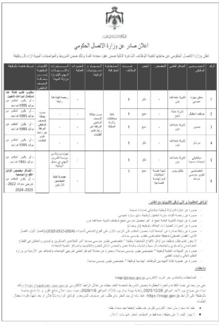 القبة نيوز - أصدرت وزارة الاتصال الحكومي إعلانًا رسميًّا عن حاجتها لتعبئة عدد من الوظائف الشاغرة ضمن عقود محددة المدة، داعيةً الكفاءات المؤهلة من الفئات المستهدفة إلى التقدُّم وفق الشروط والمواصفات المحددة لكل وظيفة.