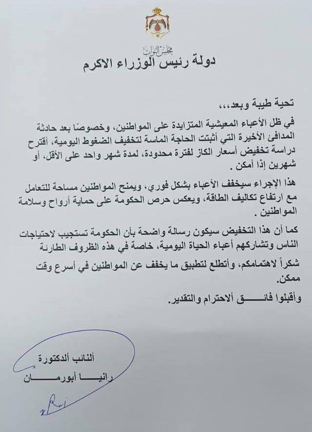 القبة نيوز- في استجابة وُصفت بالمهمة خلال ذروة فصل الشتاء، قررت الحكومة تخفيض سعر مادة الكاز، عقب مطالبات نيابية قادتها النائب الدكتورة رانيا أبو رمان، ركّزت فيها على الأعباء المعيشية المتزايدة التي تتحملها الأسر، لا سيما في ما يتعلق بتكاليف التدفئة.