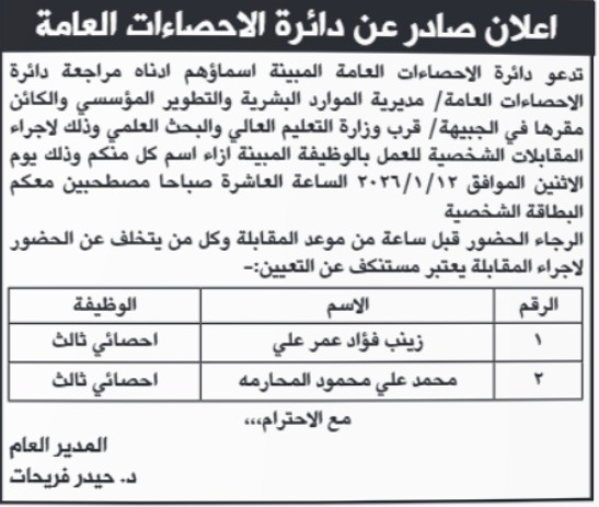دعت دوائر حكومية، اليوم الاثنين، الأشخاص التالية أسماؤهم، إلى التوجه لإجراء المقابلة الشخصية وفق المواعيد والإجراءات المحددة.