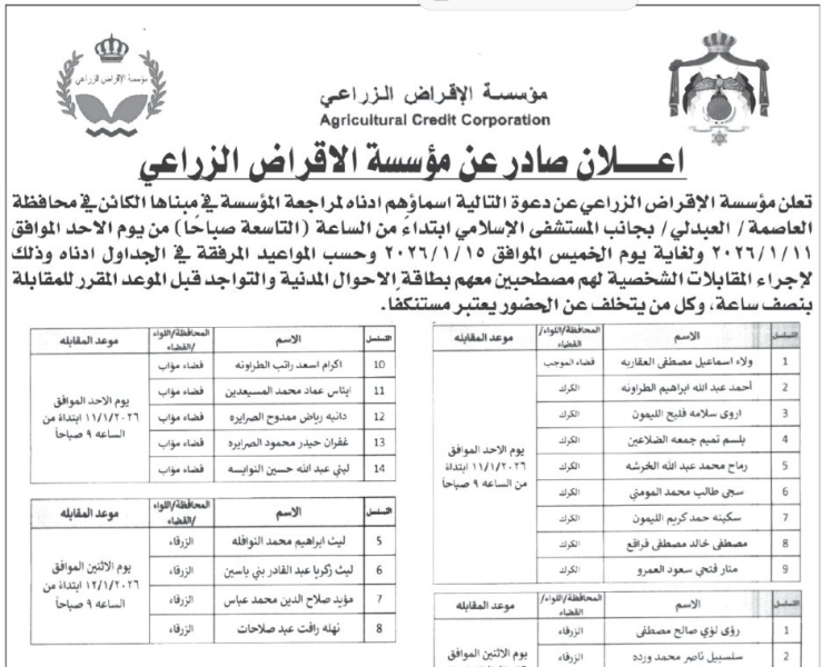 أردنيون مدعوون لإجراء المقابلات الشخصية_ قائمة الأسماء