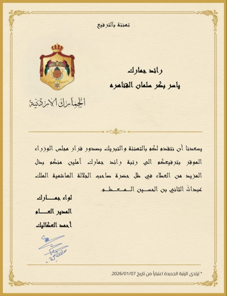 ويُعَد هذا الترفيع تقديراً لجهوده المتميزة وأدائه المهني المتميز خلال مسيرته العملية، مؤكدين له دوام التوفيق والنجاح في مهامه الجديدة ومسؤولياته القيادية ضمن أسرة الجمارك الأردنية.