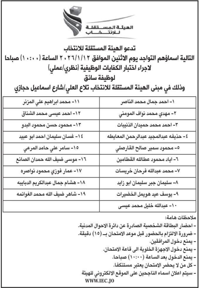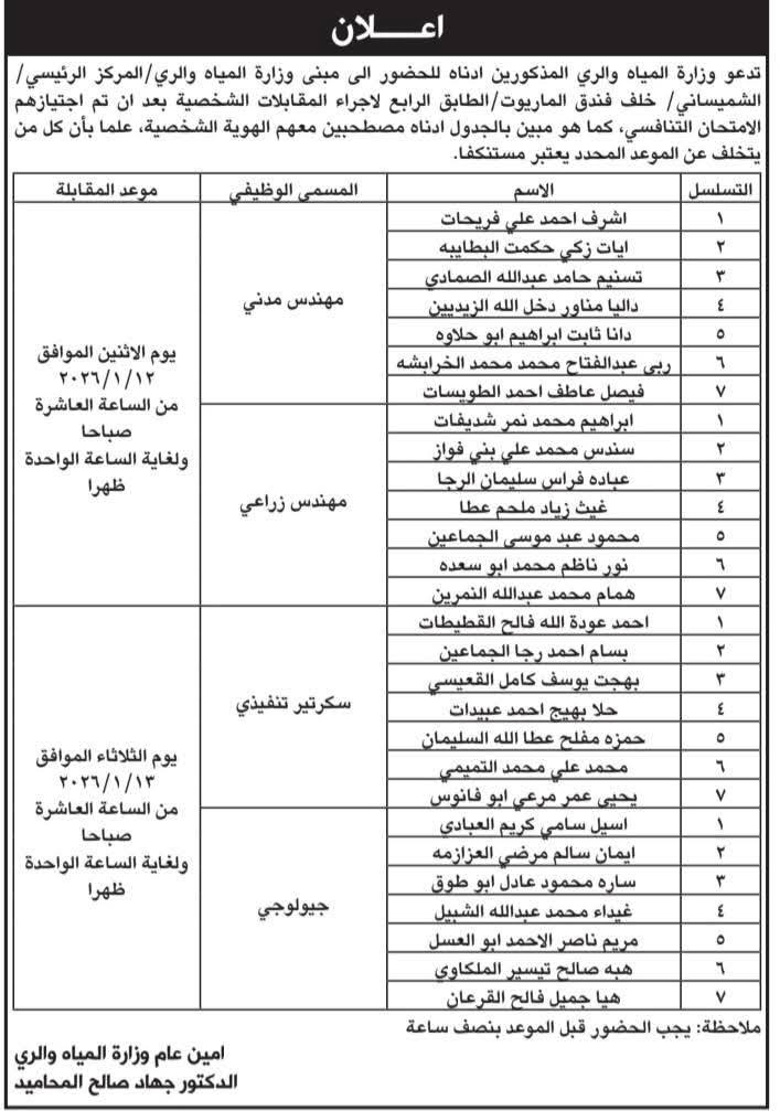 - أسماء المدعوين للمقابلات الشخصية لوظائف وزارة المياه و الري /الهيئة المستقلة للانتخابات.