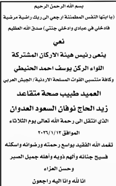 القبة نيوز - نعت القوات المسلحة الأردنية – الجيش العربي، رئيس هيئة الأركان المشتركة اللواء الركن يوسف أحمد الحنيطي، وكافة منتسبي الجيش، العميد الطبيب المتقاعد زيد الحاج نوفان السعود العدوان، الذي انتقل إلى رحمة الله تعالى.