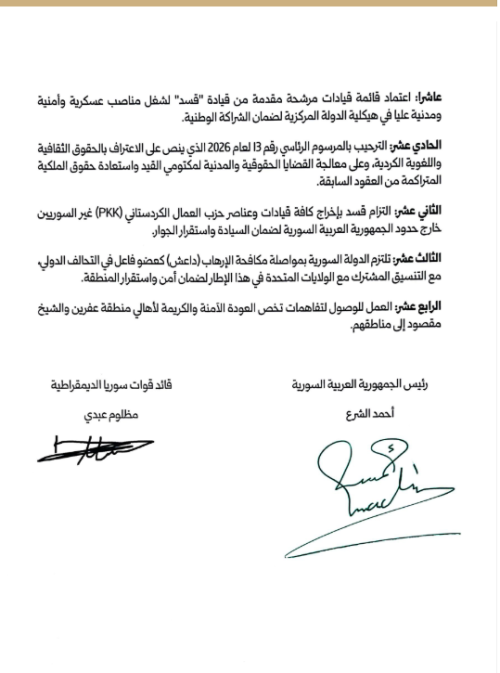 واعتماد قائمة قيادات مرشحة مقدمة من قيادة "قسد" لشغل مناصب عسكرية وأمنية ومدنية عليا في هيكلية الدولة المركزية لضمان الشراكة الوطنية.