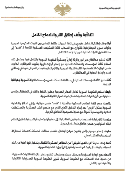 تعرف على بنود اتفاقية وقف إطلاق النار والاندماج الكامل بين الحكومة السورية و"قسد"