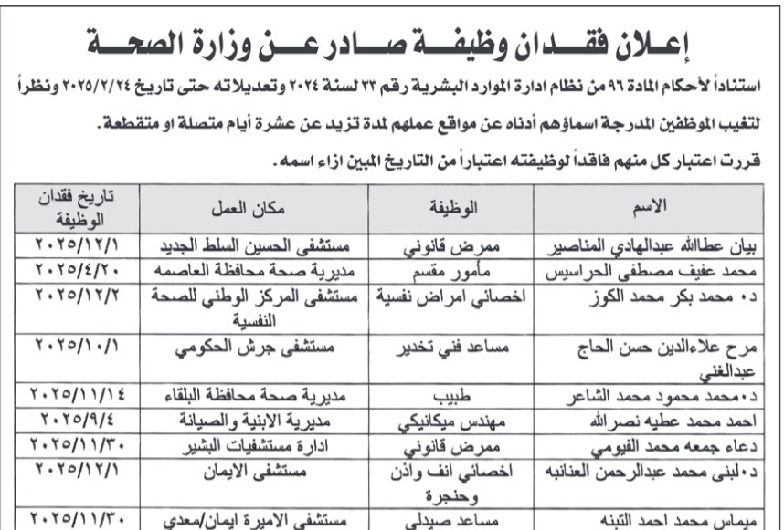القبة نيوز - قررت وزارة الصحة إنهاء خدمات الموظفين المدرجة أسماؤهم أدناه، بعد تغيبهم عن مواقع عملهم لمدة تزيد على عشرة أيام، سواء كانت متواصلة أو متقطعة، وذلك وفقًا لأحكام المادة (96) من نظام إدارة الموارد البشرية رقم (33) لسنة 2024 وتعديلاته.