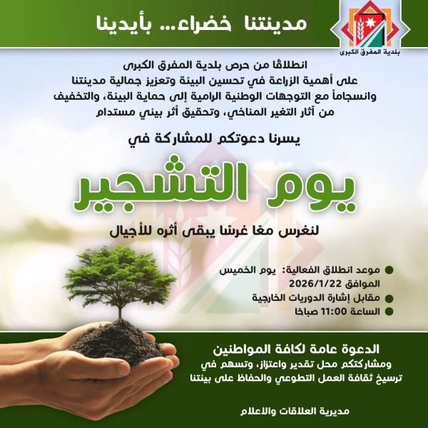 ودعت البلدية المواطنين للمشاركة في مبادرة #مدينتنا_خضراء… بأيدينا، انطلاقًا من حرصها على تعزيز دور الزراعة في تحسين البيئة وجمال المدينة، مؤكدة أن المشاركة العامة أسهمت في ترسيخ ثقافة العمل التطوعي وجعل المفرق أكثر خضرة وجمالًا.