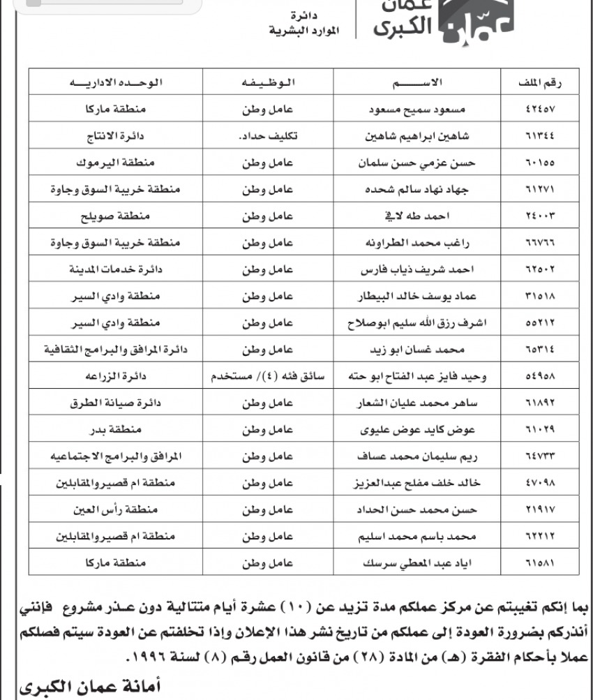 إنذار رسمي من أمانة عمّان لموظفين متغيبين: العودة فورًا أو الفصل النهائي