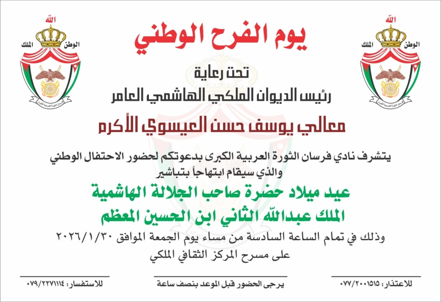 ويأتي هذا الاحتفال تعبيرًا عن الفرح والاعتزاز الوطني بهذه المناسبة الغالية، حيث يُقام مساء يوم الجمعة الموافق 30 كانون الثاني 2026، في تمام الساعة السادسة مساءً، على مسرح المركز الثقافي الملكي، بمشاركة رسمية وشعبية واسعة.