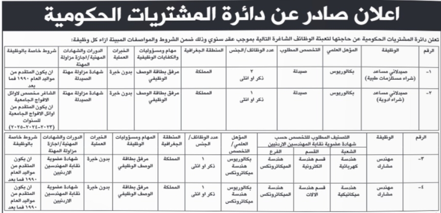 دائرة المشتريات الحكومية تعلن عن توفر وظائف شاغرة