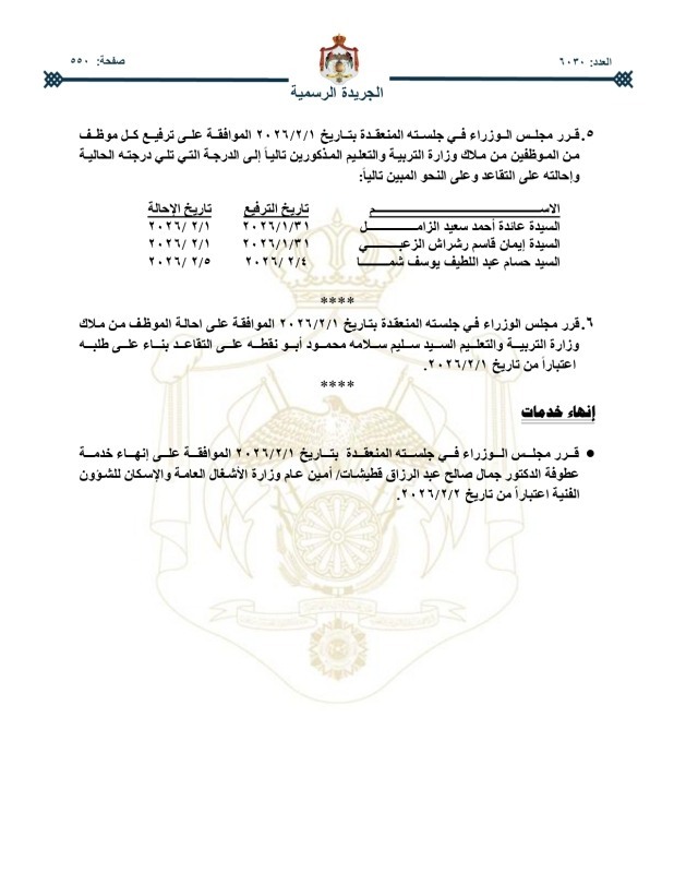 قرر مجلس الوزراء ترفيع موظفين في عدد من الوزارات والدوائر والمؤسسات وإحالات إلى التقاعد.