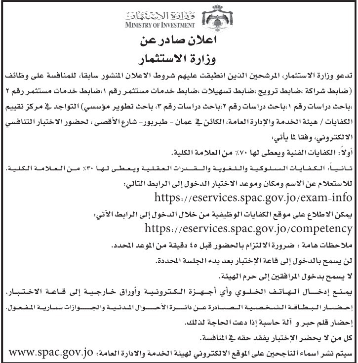 دعت وزارة الاستثمار، اليوم الاحد المرشحين الذين انطبقت عليهم شروط الاعلان المنشور سابقا للامتحان التنافسي.