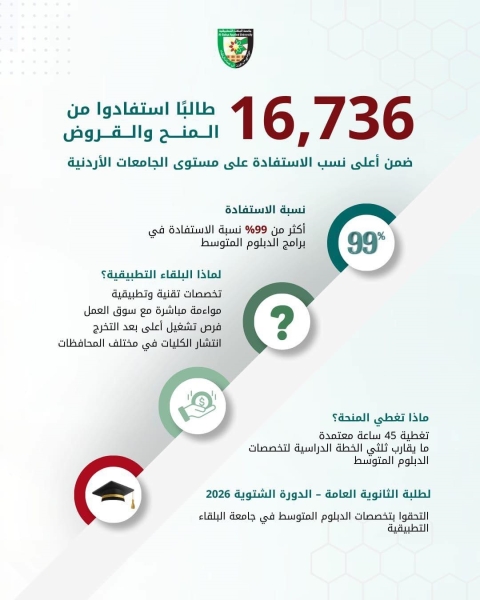 وقال رئيس الجامعة، الدكتور أحمد فخري العجلوني، إن عدد الطلبة الذين استفادوا من منح وقروض صندوق دعم الطالب بلغ 16,736 طالبًا وطالبة، مشيرًا إلى أن نسبة الاستفادة في تخصصات الدبلوم المتوسط تجاوزت 99%، وهي من الأعلى مقارنة بباقي الجامعات.