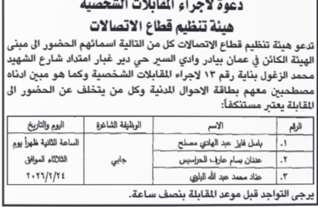 تدعو هيئة تنظيم قطاع الاتصالات اليوم الثلاثاء التالية اسماؤهم لاجراء المقابلات الشخصية.