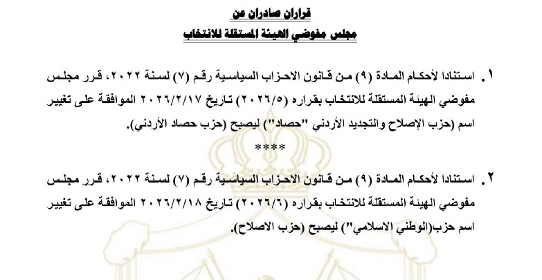 وبحسب الوثيقة، وافق المجلس في 17 شباط 2026 على تغيير اسم "حزب الإصلاح والتجديد الأردني – حصاد" ليصبح "حزب حصاد الأردني".