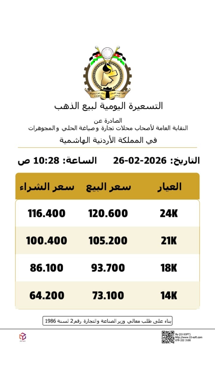القبة نيوز -  أصدرت النقابة العامة لأصحاب محلات تجارة وصياغة الحلي والمجوهرات، صباح الخميس، التسعيرة اليومية لبيع الذهب في السوق المحلية.