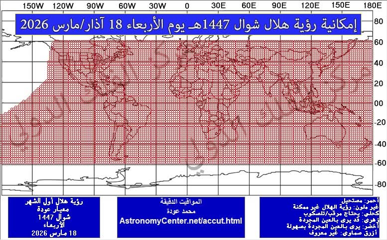 القبة نيوز - أفادت الحسابات الفلكية بأن تحرّي هلال شهر شوال مساء اليوم الأربعاء الموافق 18 مارس 2026، لن يُفضي إلى ثبوت الرؤية في عدد من الدول الإسلامية، وذلك بسبب غروب القمر قبل غروب الشمس، ما يجعل رؤية الهلال مستحيلة من الناحية الفلكية.