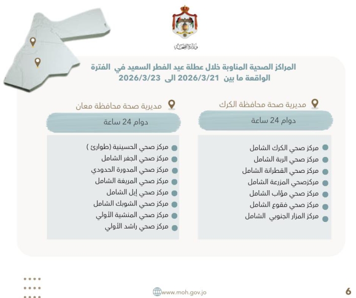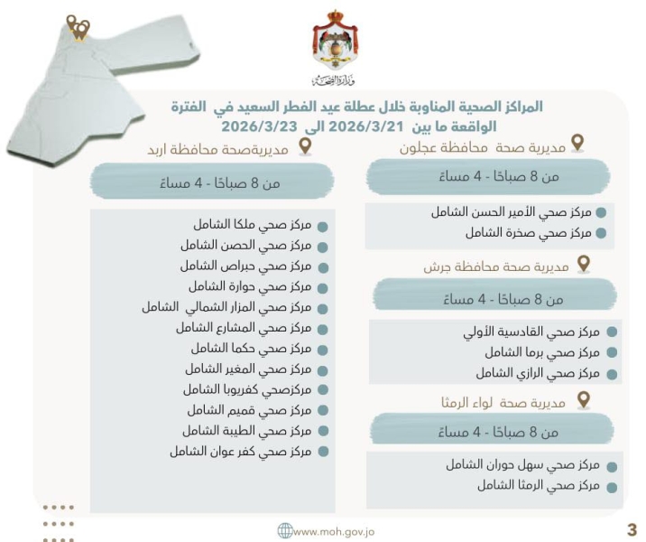 القبة نيوز -  أعلنت وزارة الصحة، يوم الخميس، عن أسماء المراكز الصحية التي ستعمل بنظام المناوبة خلال عطلة عيد الفطر السعيد، وذلك خلال الفترة الممتدة من 21 إلى 23 آذار 2026، في مختلف محافظات المملكة.