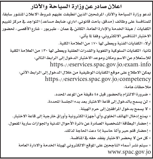 القبة نيوز - دعت وزارة السياحة والآثار الأردنية، اليوم الاثنين، المرشحين الذين تنطبق عليهم شروط الإعلان السابق إلى التقدم للامتحان التنافسي المقرر.