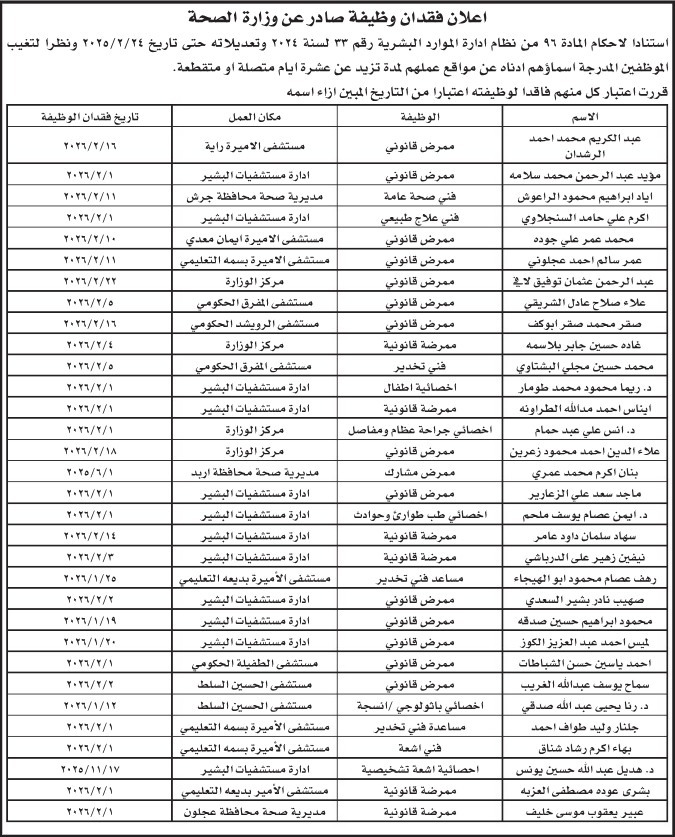 وفي سياق منفصل، أعلنت وزارة الصحة الأردنية عن إنهاء خدمات عدد من الموظفين، استنادًا إلى أحكام المادة (96) من نظام إدارة الموارد البشرية رقم (33) لسنة 2024 وتعديلاته حتى تاريخ 24 فبراير 2025.