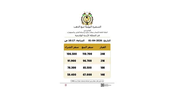 وبلغ سعر الذهب عيار 21، الأكثر رغبة لدى المواطنين، 96.7 دينارًا.