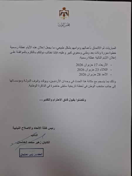 وقال الخشمان، في مذكرة رسمية موجهة إلى دولة رئيس الوزراء الدكتور جعفر حسان، إن هذا الطلب ينطلق من مسؤولية وطنية صادقة، ومن إدراك عميق لحجم الفرح الشعبي الذي يعيشه الأردنيون وهم يترقبون ظهور منتخبهم الوطني في نهائيات كأس العالم، بعد انتظار طويل لهذا الإنجاز الذي شكّل لحظة فخر واعتزاز لكل بيت أردني.