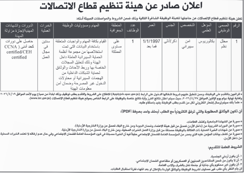 القبة نيوز- أعلنت هيئة تنظيم قطاع الاتصالات اليوم الأحد، عن حاجتها لتعبئة وظيفة شاغرة ضمن شروط ومواصفات معينة.