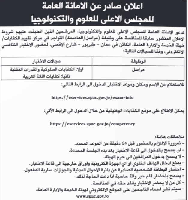 كما أعلن المجلس الأعلى للعلوم والتكنولوجيا عن دعوته لعدد من الأشخاص ممن انطبقت عليهم شروط اعلان المنافسة على وظيفة مراسل في عمان للاختبار التنافسي.